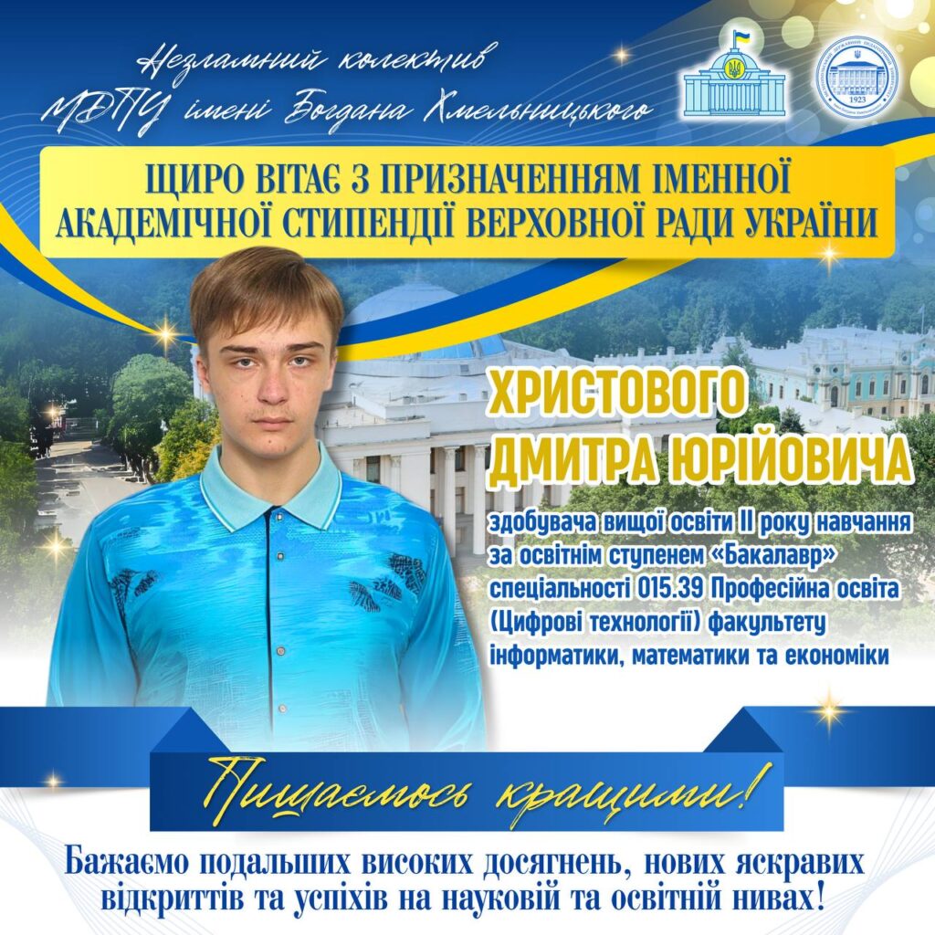 Кафедра інформатики і кібернетики щиро вітає Христового Дмитра Юрійовича, здобувача вищої освіти ІІ року навчання за освітнім ступенем «Бакалавр» спеціальності 015.39 Професійна освіта (Цифрові технології) факультету інформатики, математики та економіки, з призначенням стипендії Верховної Ради України.